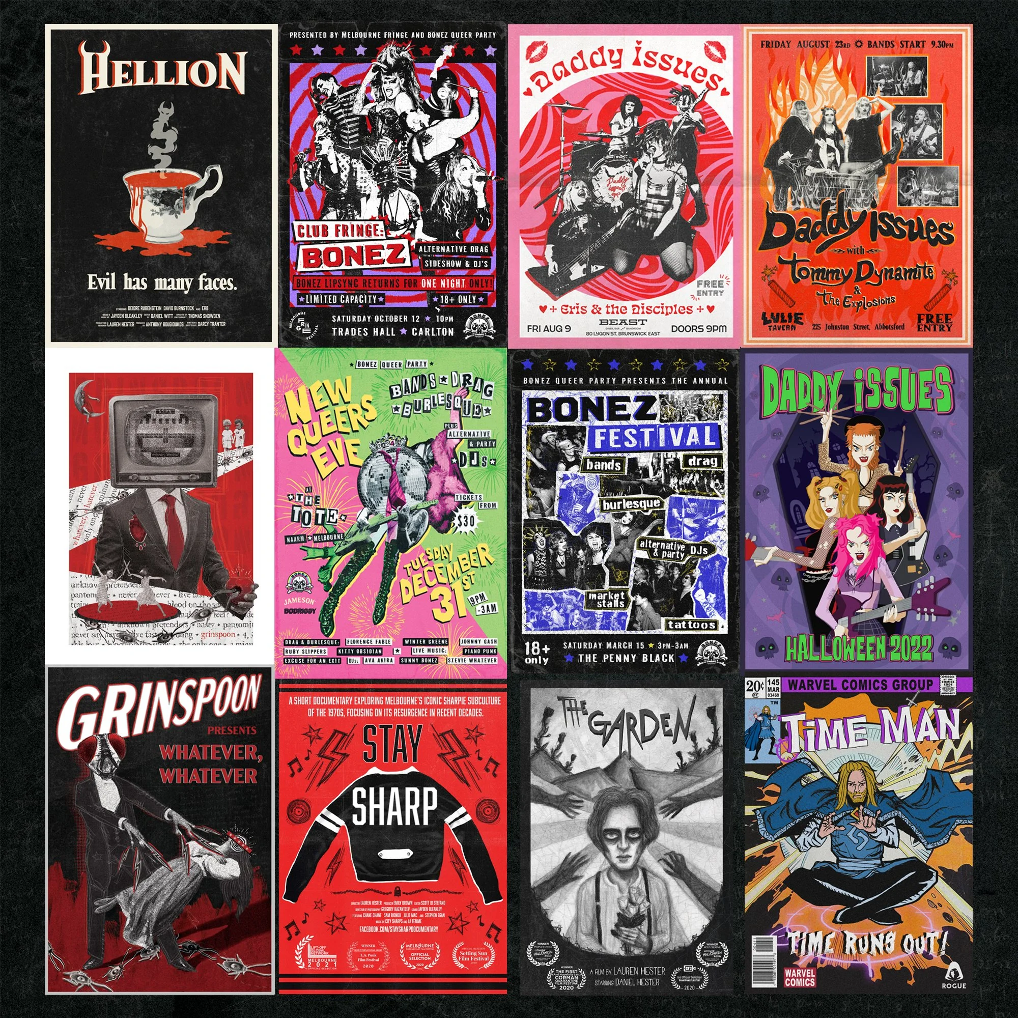 Eye-catching posters for bands, films, events, and merchandise.